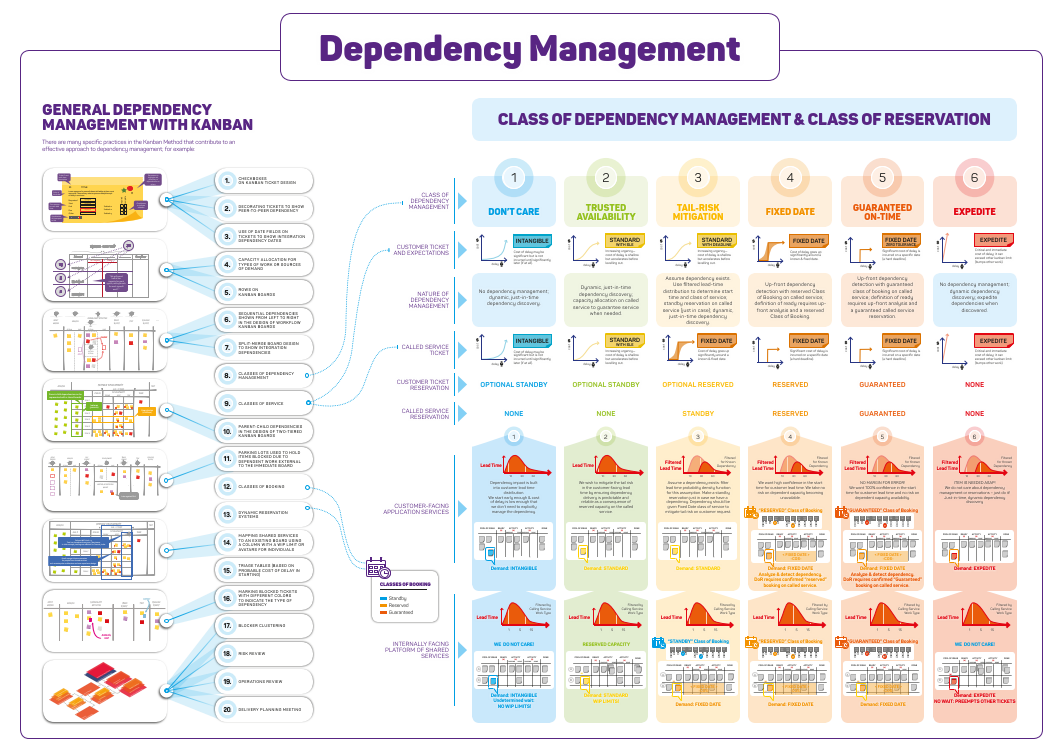 Algunas de las prácticas mencionadas anteriormente son de uso común con kanban y, por lo tanto, el método ya tiene incorporada alguna capacidad básica para gestionar con éxito las dependencias. Sin embargo, es posible que se necesiten algunas prácticas específicas para la gestión de la dependencia a fin de evitar demoras y cumplir con las expectativas. La clave para saber si es necesaria una gestión explícita de la dependencia requiere comprender el costo o el impacto de la demora en el elemento solicitado: si una dependencia mal gestionada causa una demora, ¿qué tan grave será el daño? Cuando el costo del retraso es bajo, es mejor simplemente dejar que se produzcan dependencias y gestionarlas a medida que se producen. No hay necesidad de gastos generales ni burocracia adicionales.